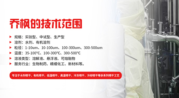 上海喬楓實業(yè)有限公司,成立于2012年,是從事噴霧干燥設(shè)備的研發(fā)設(shè)計、生產(chǎn)、銷售(小型噴霧干燥機,實驗型噴霧干燥機,35℃低溫噴霧干燥機,有機溶劑噴霧干燥機低溫閉式循環(huán)噴霧干燥機超細粉末噴霧干燥機噴霧冷凍干燥機真空噴霧干燥機氣流噴霧干燥機噴霧造粒干燥機離心噴霧干燥機,沸騰制粒機等)和售后于一體的綜合性公司,本公司現(xiàn)成為一家致力于為生物制藥、精細化工、新能源、陶瓷造粒及食品工程等領(lǐng)域提供全套解決方案的整線交鑰匙工程企業(yè)。